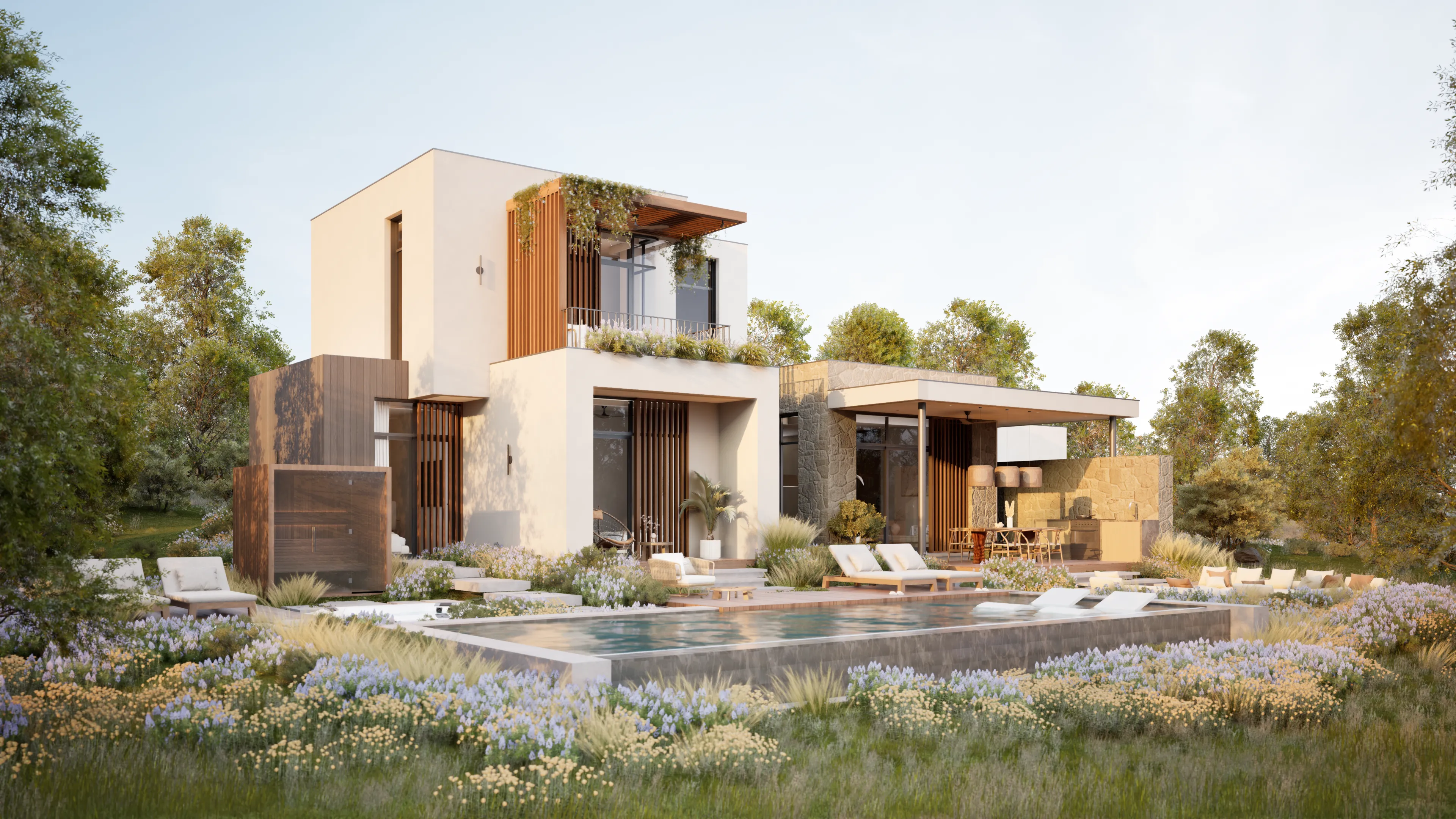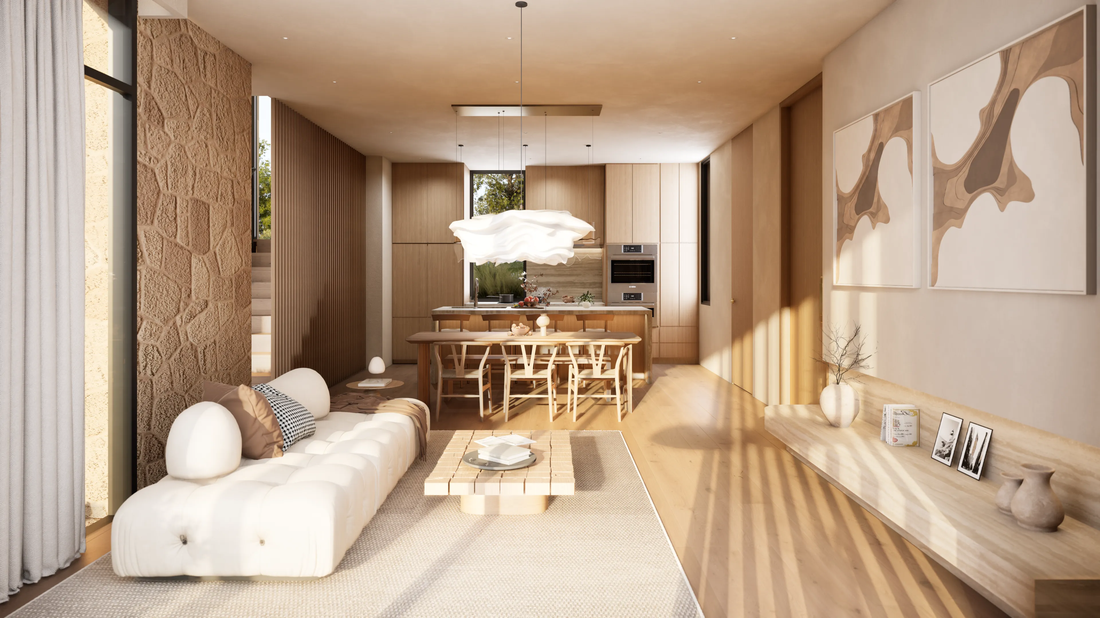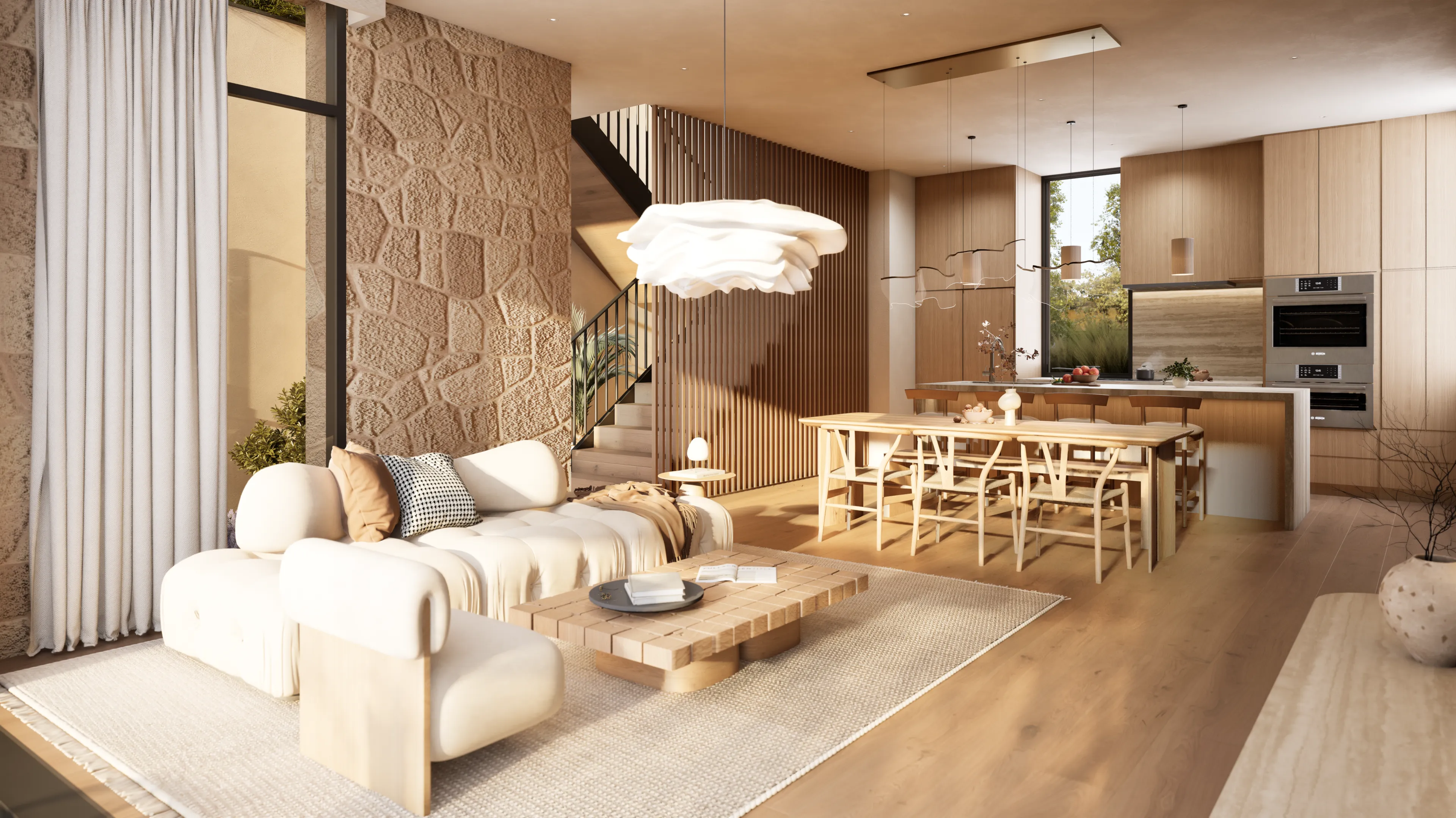 Sanctuary's home design is crafted to be breathtaking and stunning. We have curated a harmonious blend of wood, stone, and lime plaster in common areas to create a warm and inviting atmosphere.