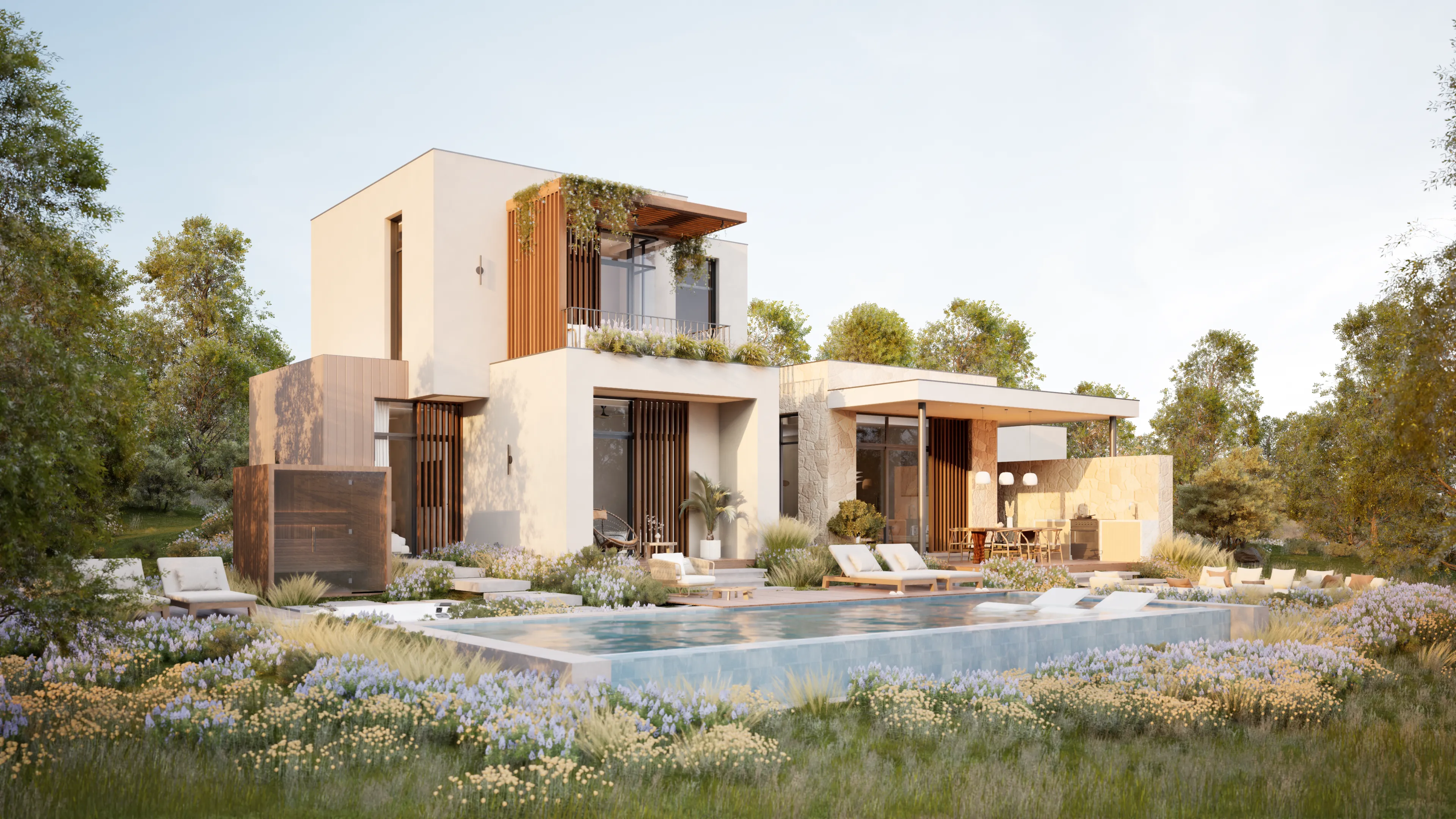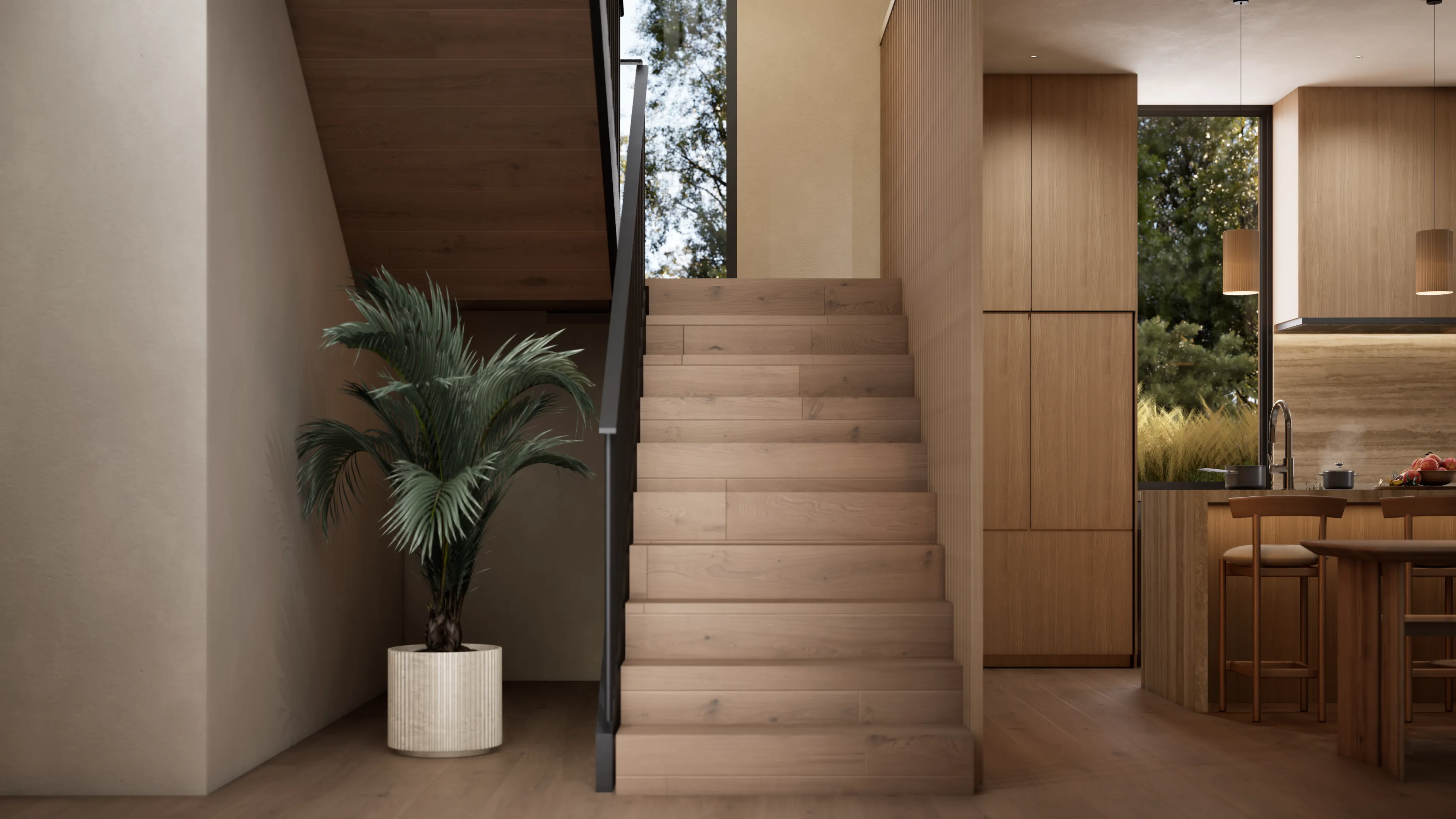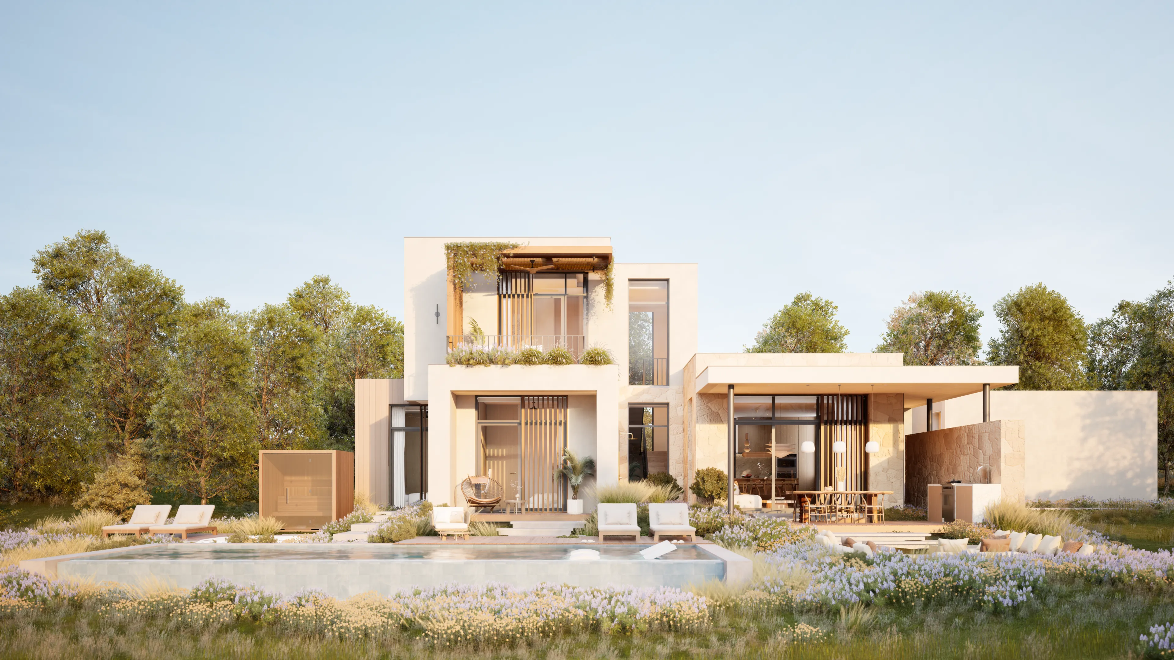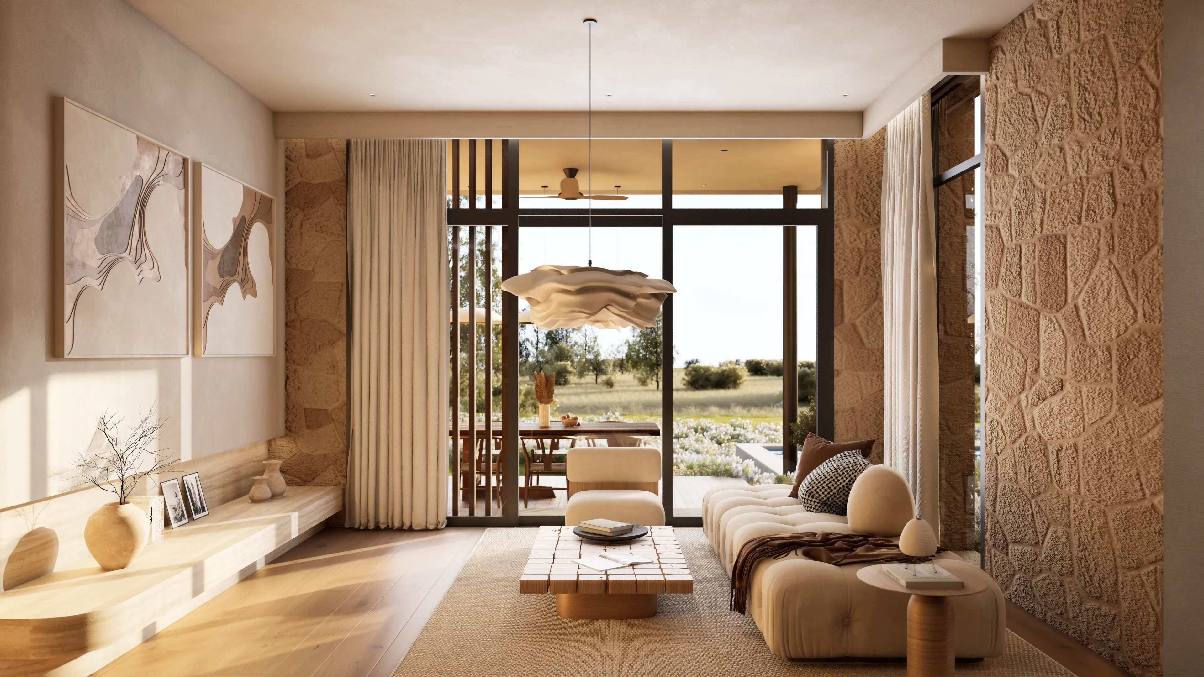 Sanctuary's home design is crafted to be breathtaking and stunning. We have curated a harmonious blend of wood, stone, and lime plaster in common areas to create a warm and inviting atmosphere.