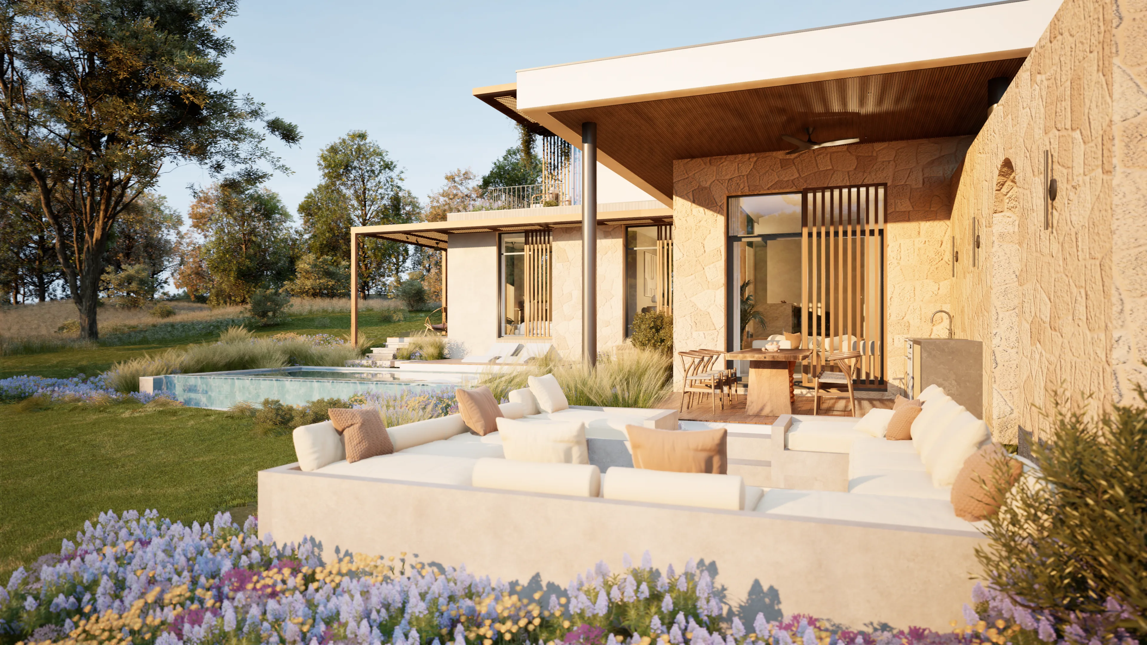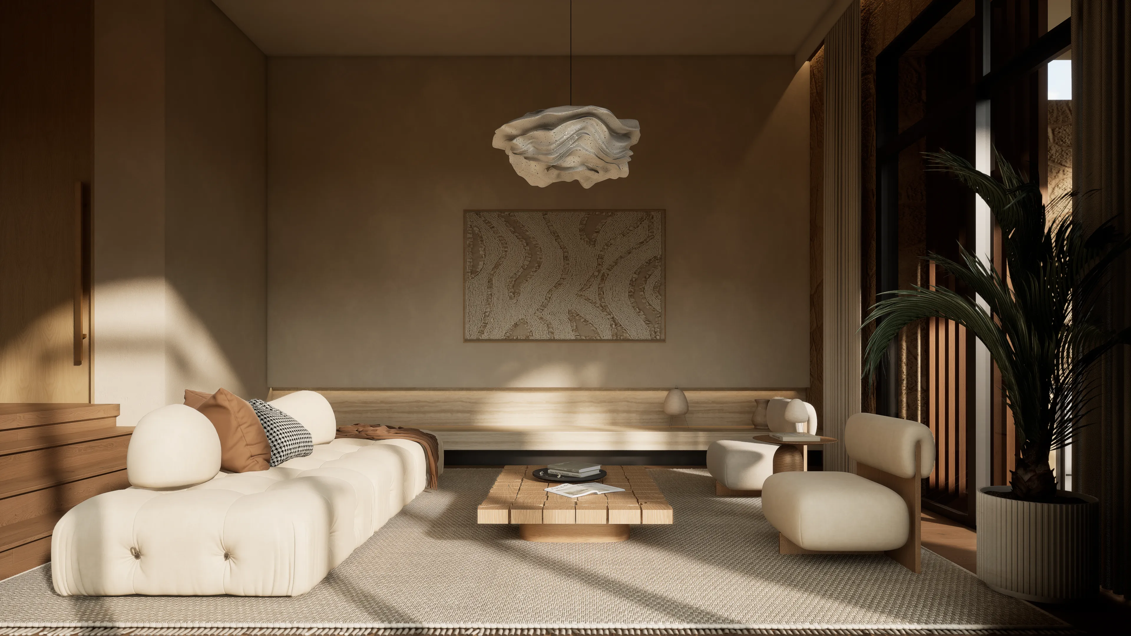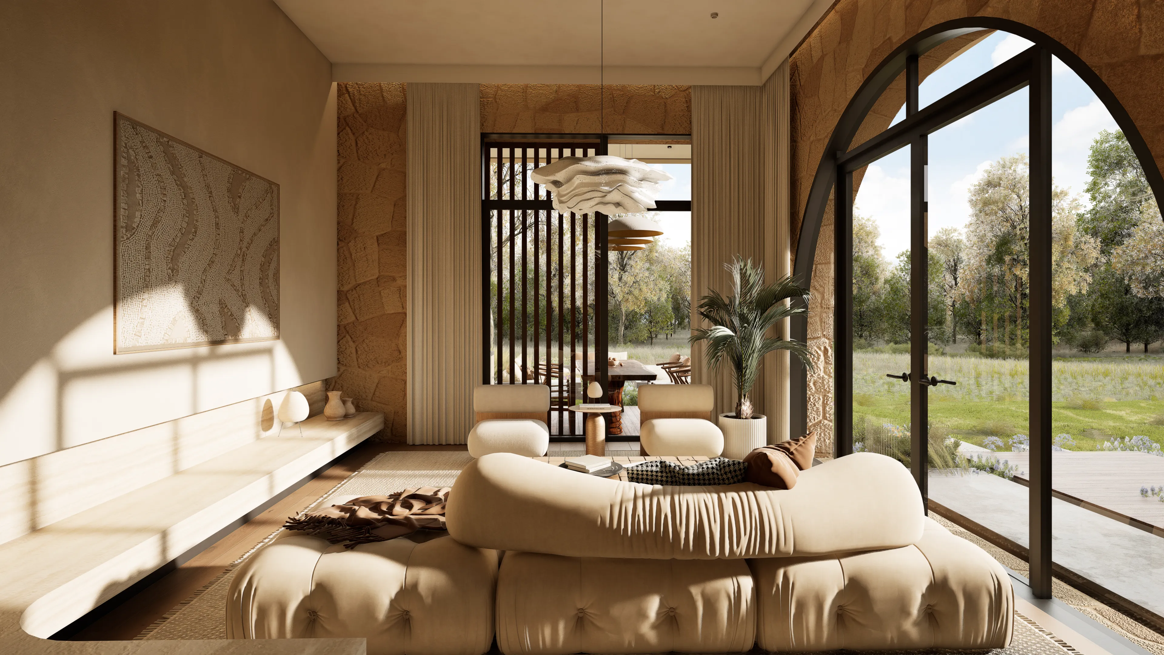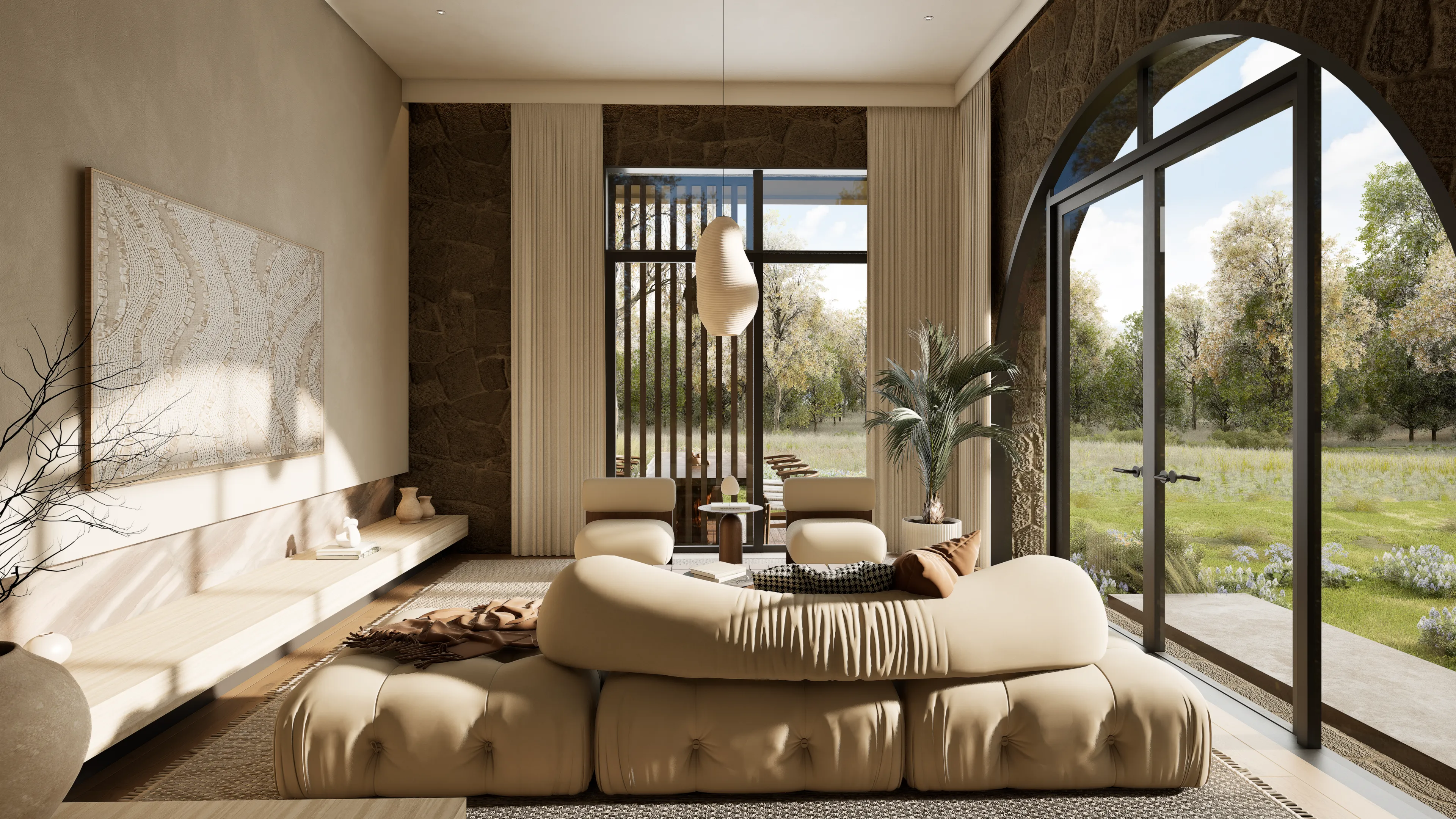 Sanctuary's home design is crafted to be breathtaking and stunning. We have curated a harmonious blend of wood, stone, and lime plaster in common areas to create a warm and inviting atmosphere.