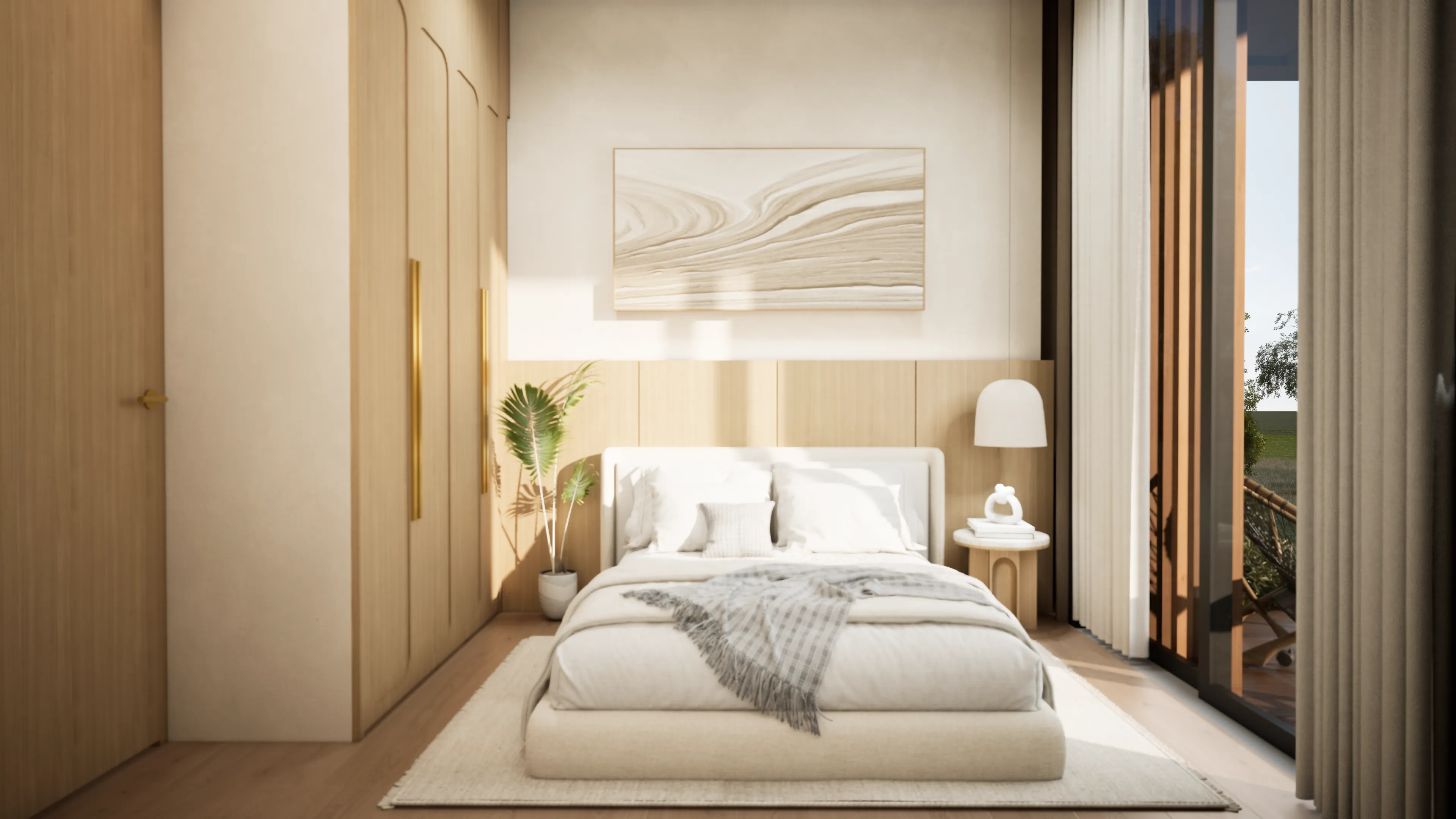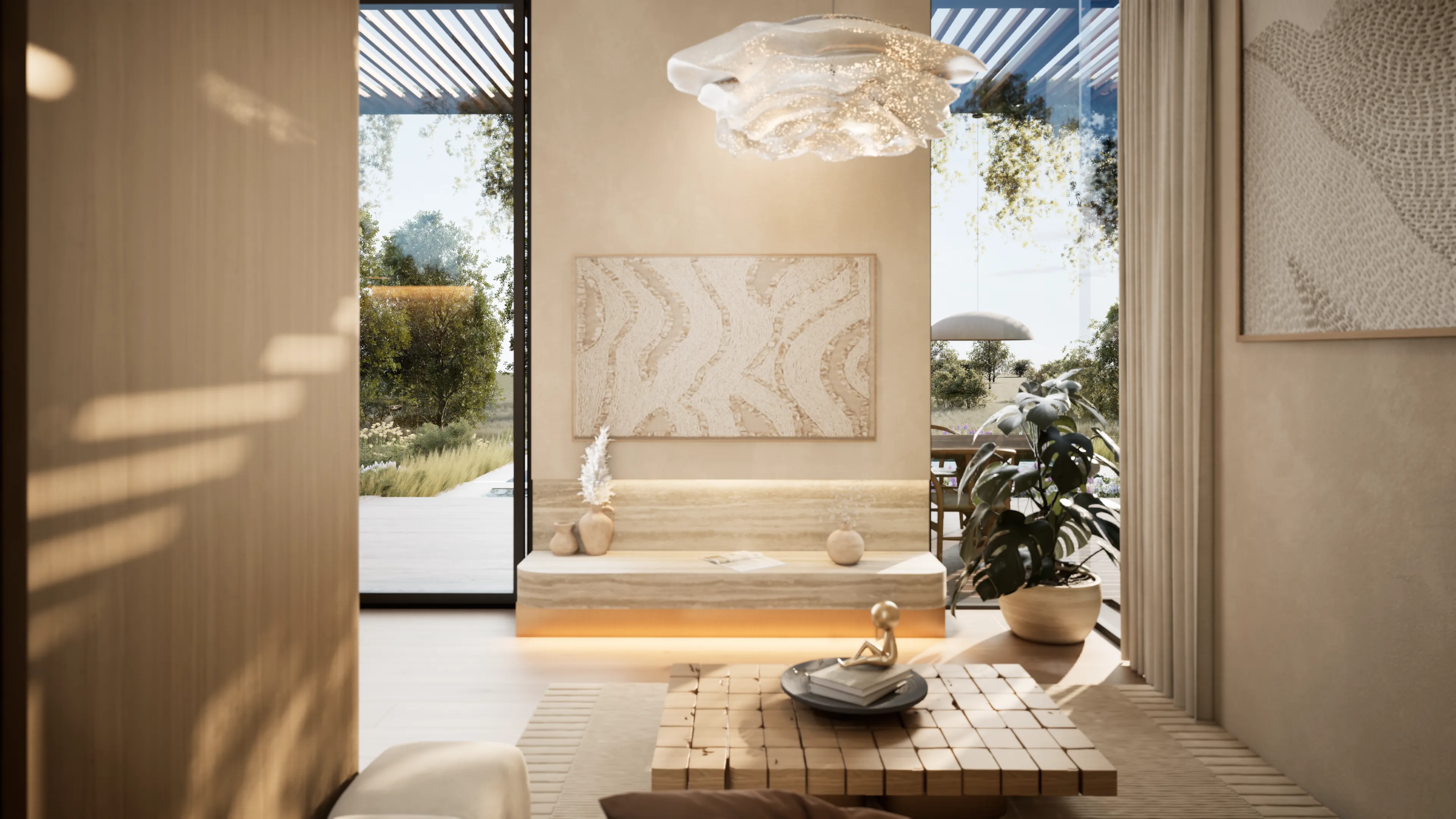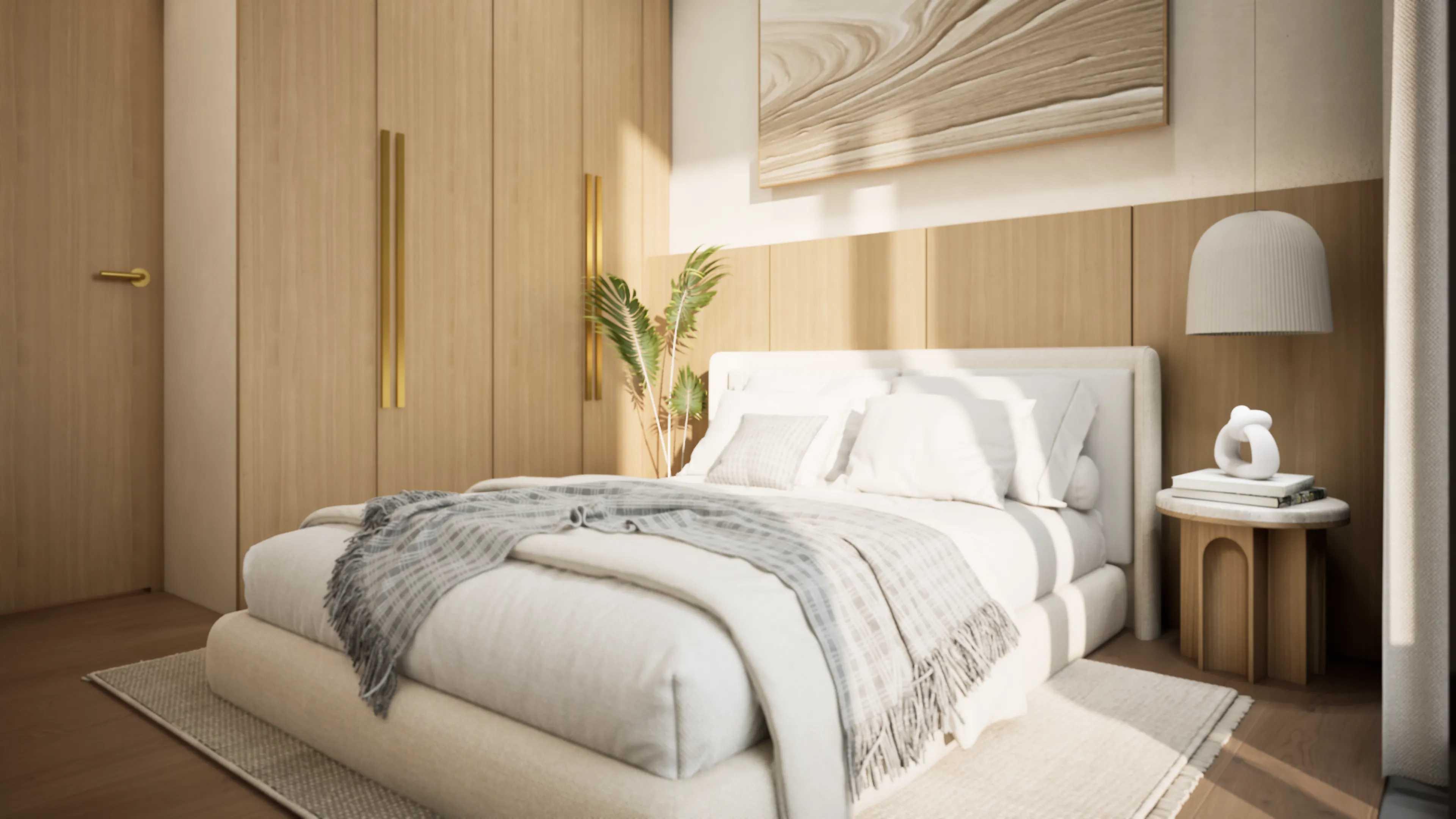 Brings lightness through soft plaster and luminous tones.