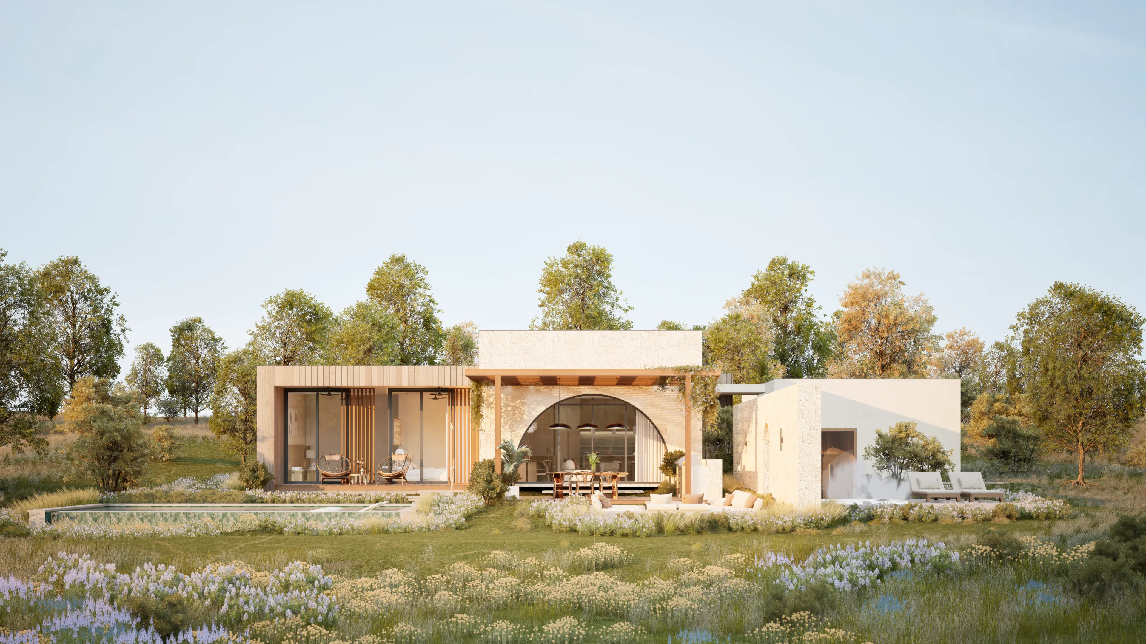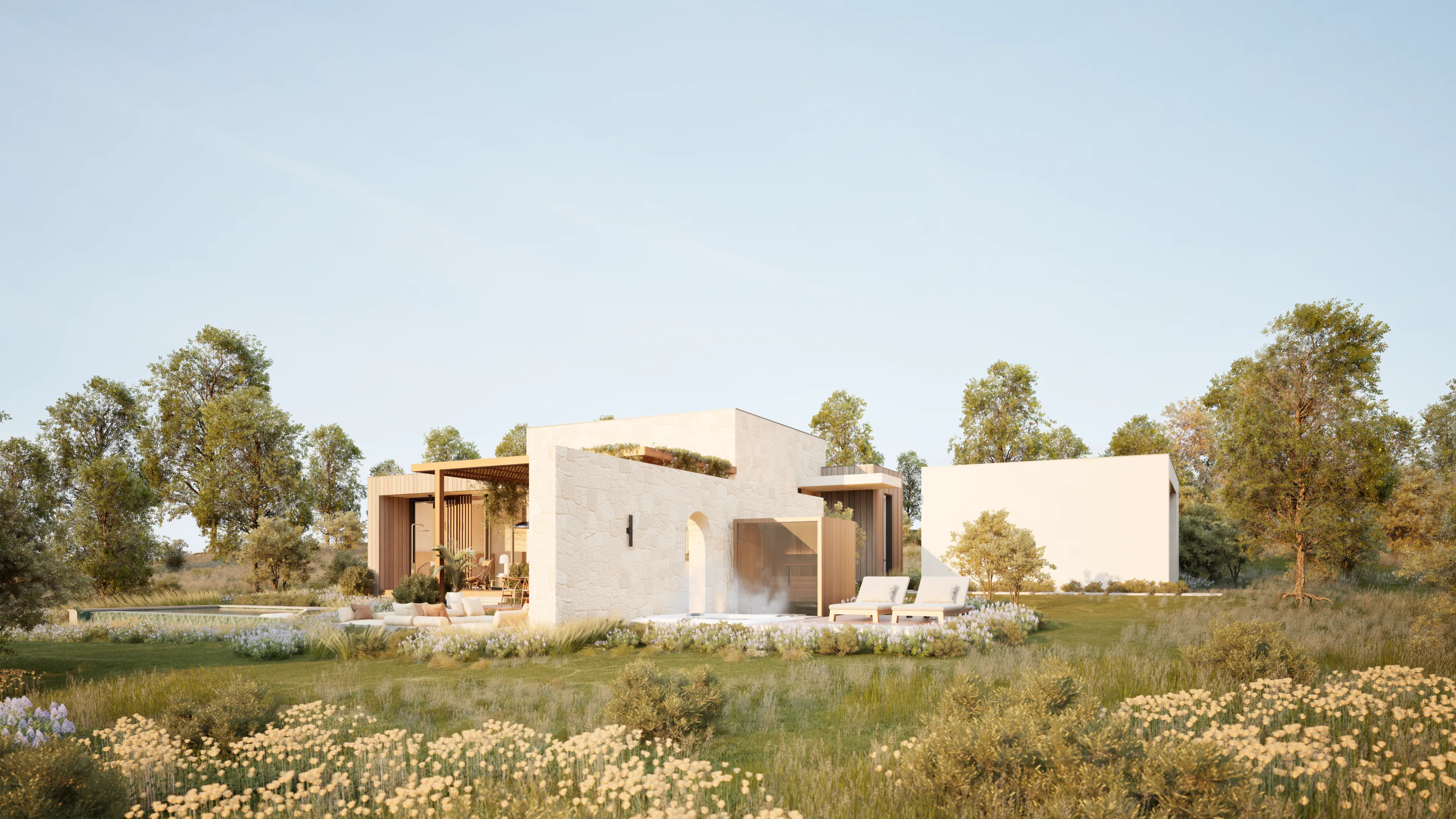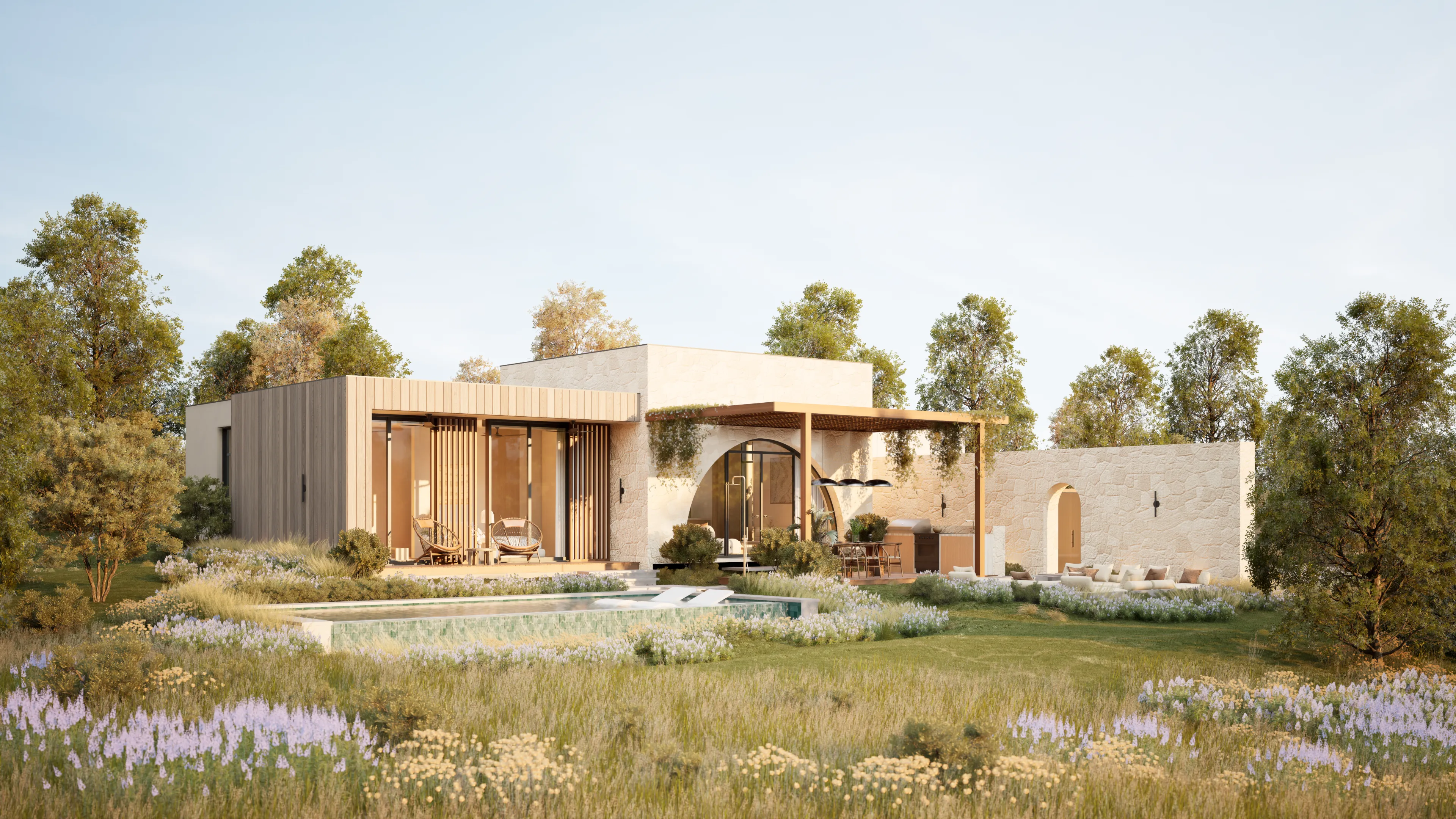 Sanctuary's home design is crafted to be breathtaking and stunning. We have curated a harmonious blend of wood, stone, and lime plaster in common areas to create a warm and inviting atmosphere.