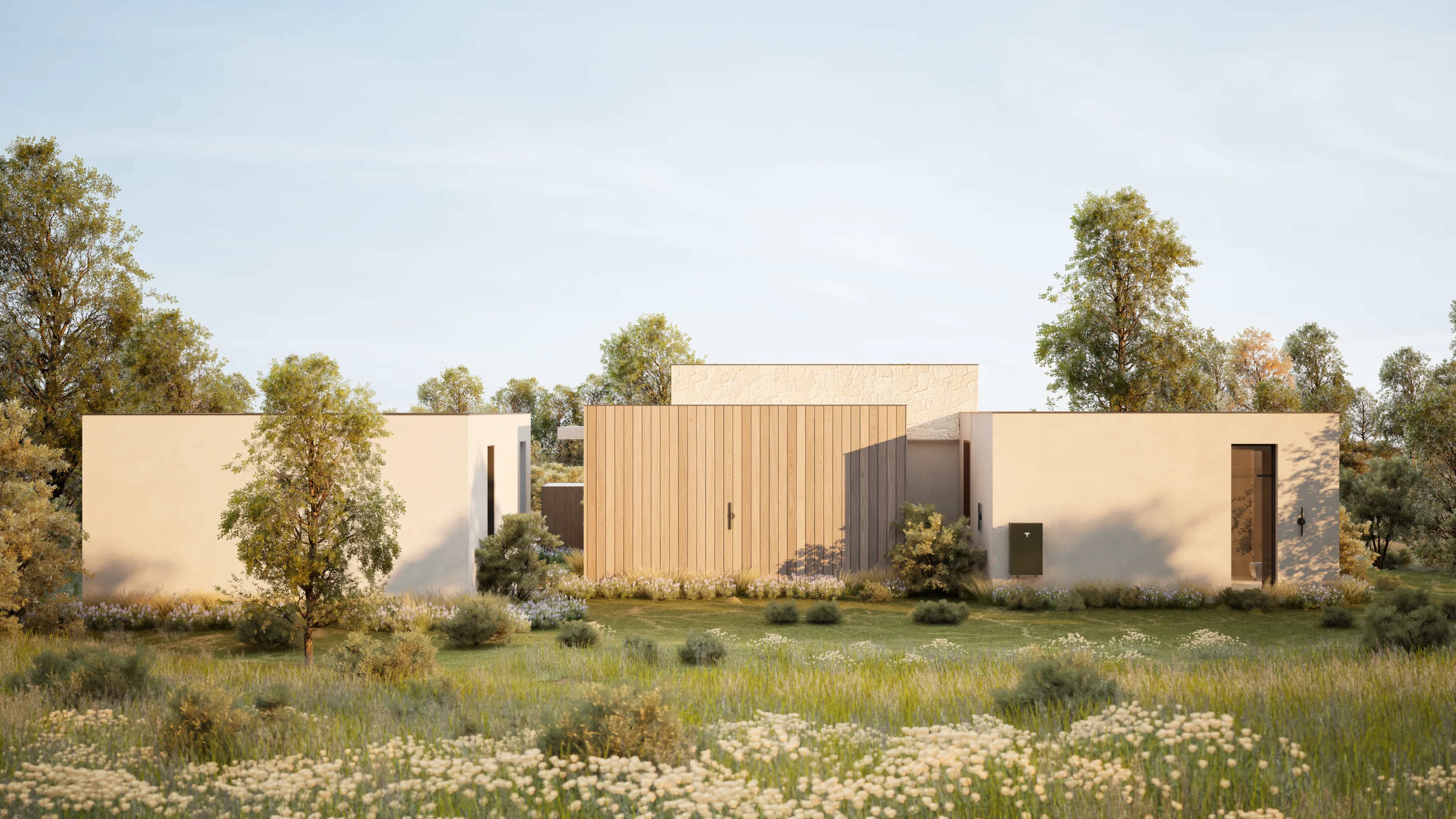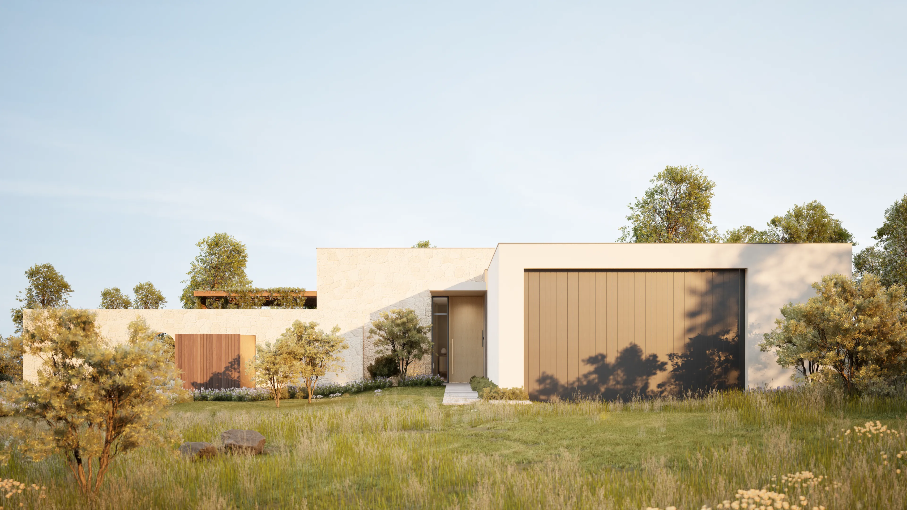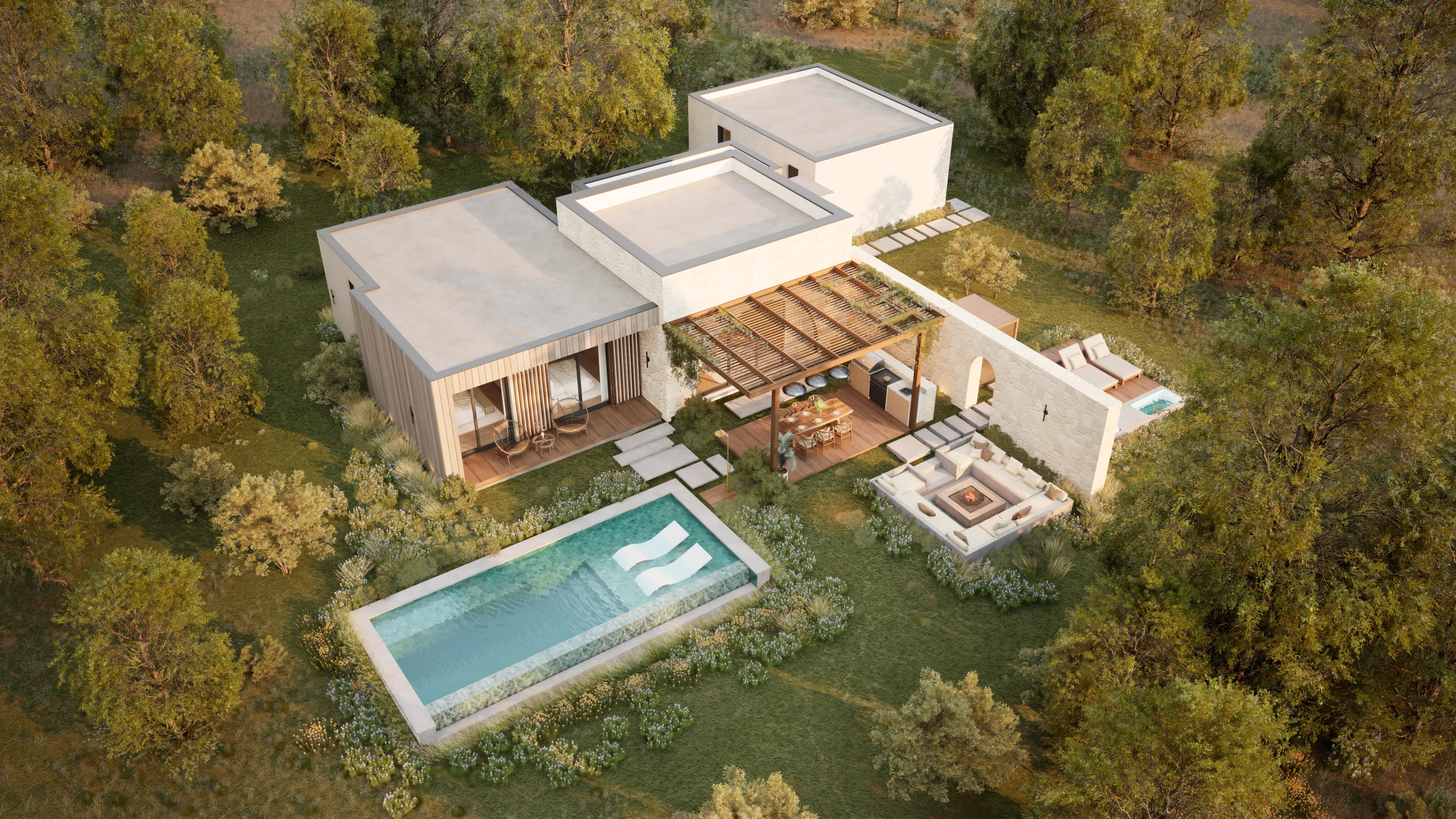 Sanctuary's home design is crafted to be breathtaking and stunning. We have curated a harmonious blend of wood, stone, and lime plaster in common areas to create a warm and inviting atmosphere.