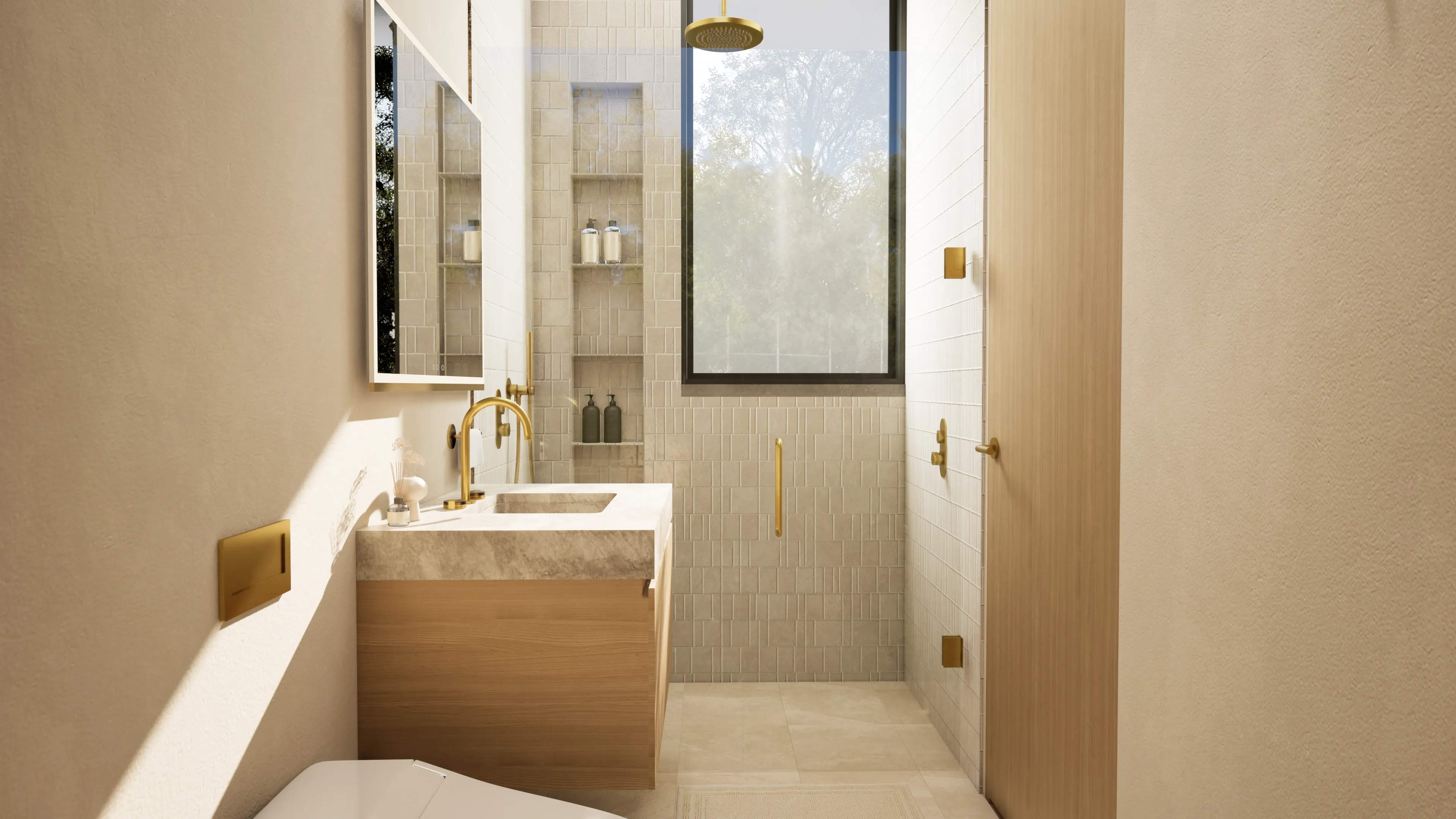 The bathroom features high-end fixtures and fittings, including rainfall showerheads.